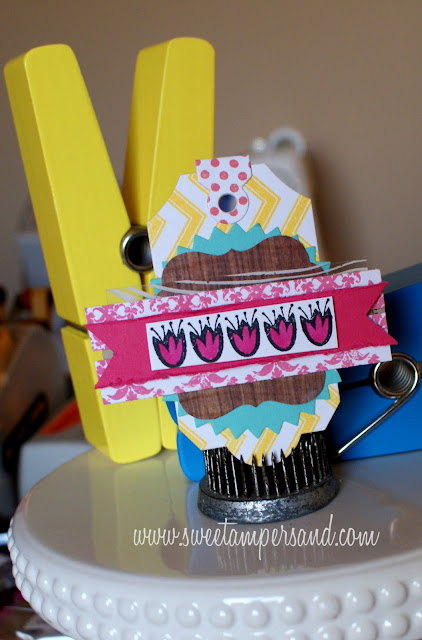 The tag insert is hand cut from a piece of patterned paper layered on a piece of melon berry cardstock. The tab at the top is the mini oval tab die from My Favorite Things and it's die cut from the same piece of kraft and white grid patterned paper attached with a few staples using my tiny attacher. The sentiment stamp is from PTI.